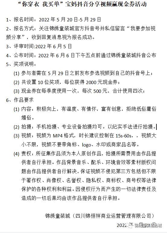 2、报名方式:关注锦绣童装城官方抖音号并私信留言“我要参加视频分享”,收到回复消息视为报名成功。